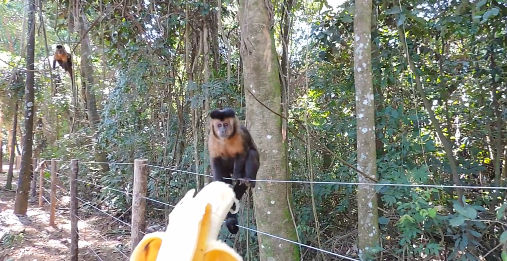 Hoje tive a oportunidade de filmar novamente o macaquinho-prego pegando banana, onde se vê a presença de dois outros do bando (ao fundo). Ele pegou banana da minha mão umas 4 vezes. Estavam ali presentes uns 8 macacos. Lindos demais!!!