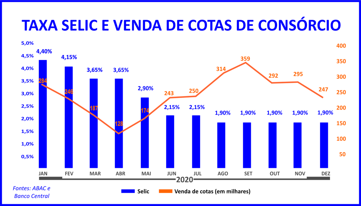 “Mas, não é só isso. É possível ainda observar que as taxas de juros atingiram níveis muito baixos para os padrões brasileiros, com a Selic em 1,90%, de agosto a dezembro daquele ano. Paralelamente, as vendas atingiram patamares superiores e até maiores do que na pré-pandemia. Aliás, contrariando a velha tese de que com juros baixos as vendas de cotas caem”, especifica o economista.