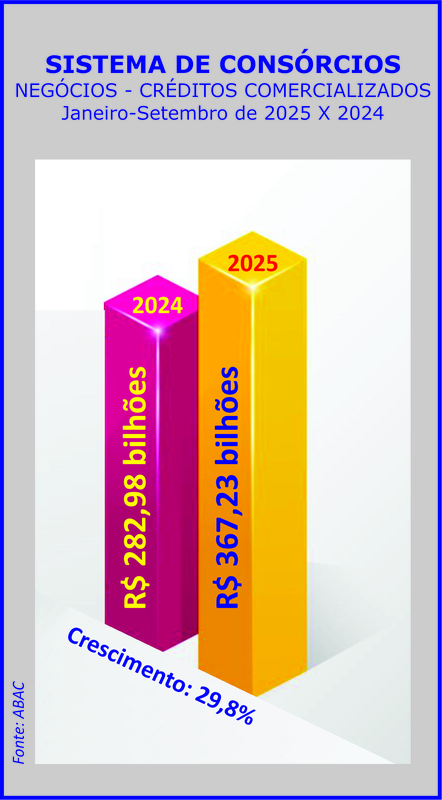 Completados nove meses do ano, os indicadores do Sistema de Consórcios atingiram volumes recordes no geral e nos diversos setores onde o mecanismo está presente. Ao acumular R$ 367,23 bilhões, os negócios realizados de janeiro a setembro cresceram 29,8% sobre os R$ 282,98 bilhões do mesmo período de 2024.