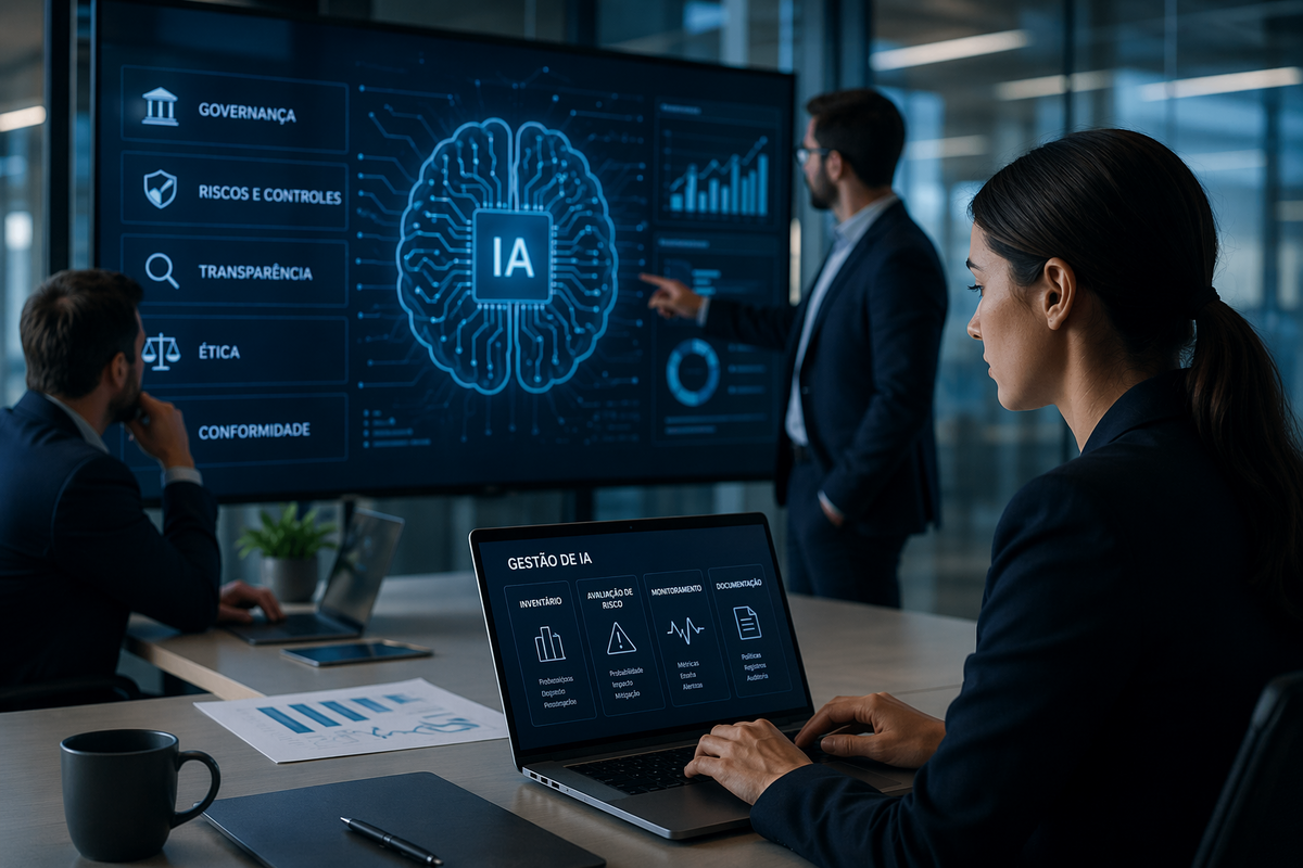 Nesse cenário, a ISO/IEC 42001 tem sido usada como uma referência internacional para estruturar sistemas de gestão de IA. Segundo a ISO, a norma se aplica a organizações que desenvolvem, fornecem ou usam IA e cobre temas como definição de responsabilidades, avaliação de riscos, governança de dados, transparência, monitoramento e melhoria contínua.