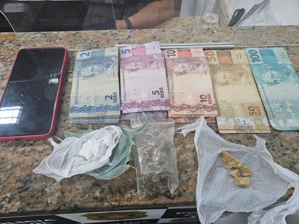 Na abordagem, os policiais localizaram dinheiro em espécie no bolso do menor. Com autorização do morador do imóvel, a equipe entrou na residência e encontrou uma bolsa preta, onde estavam escondidos entorpecentes.