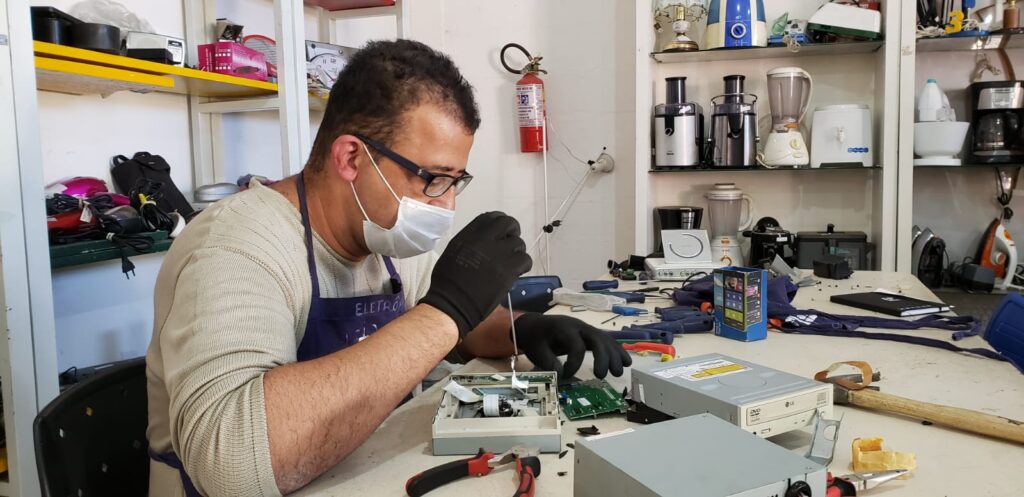 Na Oficina de Reciclagem de Eletrônicos, os produtos passarão por uma triagem e depois serão desmontados e revendidos para uma empresa de remanufatura. A renda obtida com a venda das peças é dividida entre os participantes da Oficina.