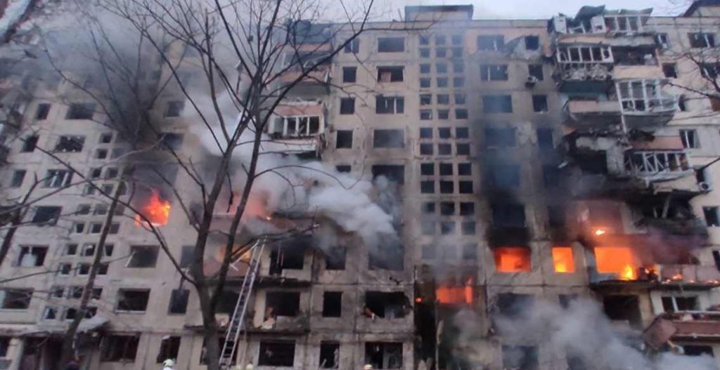 O prédio fica no distrito Obolon, zona norte da capital ucraniana. O incêndio foi controlado pelos bombeiros depois que foi alvo de disparos durante a madrugada.