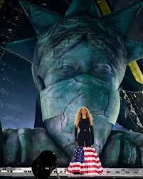 Ainda durante o espetáculo, Beyoncé trás de forma clara e objetiva o cerceamento da liberdade, o que claramente acontece no momento atual dos EUA durante a gestão Trump, com imigrantes sendo expulsos de forma violenta, ou até mesmo os ataques a direitos tirados da comunidade LGBTQIAPN+ e ela entrega esse recado com a cabeça da Estátua da Liberdade de uma forma amordaçada, sem que possa falar.