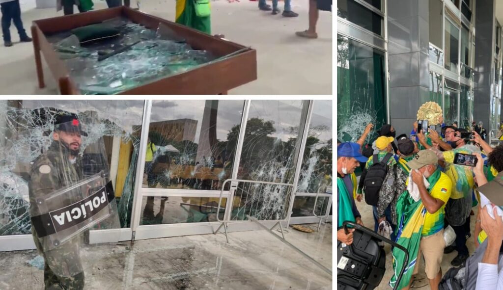 Os golpistas, que estavam concentrados há semanas em frente ao Quartel-General do Exército, invadiram primeiro a sede do Congresso Nacional e depois se dirigiram para as sedes dos outros Poderes, deixando um rastro de destruição.