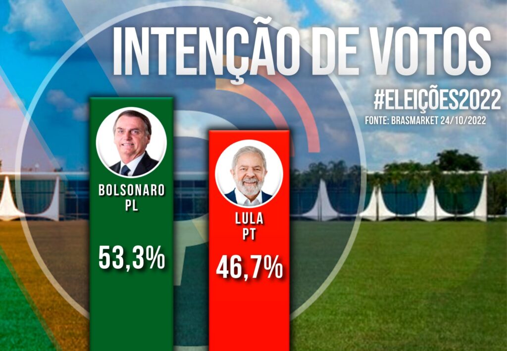 A nova pesquisa da Brasmarket publicada nesta segunda-feira, 24 de outubro, mostra um crescimento do candidato à reeleição, Jair Bolsonaro (PL), com relação à pesquisa anterior, com 53,6%, enquanto o pestista Luiz Inácio Lula da Silva tem 46,7% .