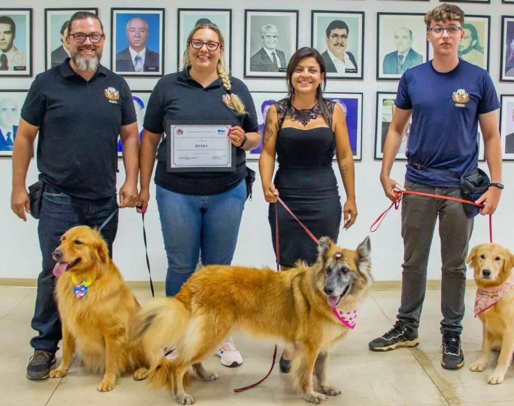 Muito legal poder registrar em nossa página de hoje a Cadela Ronda, uma Pastor Alemã que foi resgatada das ruas, quase morta, e hoje é uma cadela que faz a alegria de muitas pessoas, já que visita idosos e crianças em situação de vulnerabilidade levando alegria e amparo a eles e faz a alegria dos mesmos. A vereadora Lindsay Cardoso fez uma moção de aplausos a esta “Cãoterapeuta” na sessão da última semana da Câmara Municipal e que, agora, vai se aposentar. Ronda foi a segunda cadela no Brasil a receber uma moção de aplausos. A foto destaca a cadela Ronda junto da autora do projeto, vereadora Lindsay Cardoso e dos adestradores e tutores, Paola Limonta, Matheus Carvalho e seu filho, Rafael.