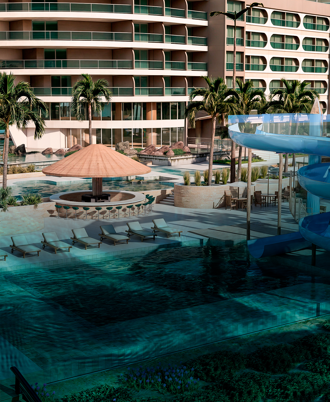 O complexo inclui ainda condomínios de lotes, apartamentos e bangalôs residenciais, integrados à natureza, com 108 mil m2 de área comum, restaurantes, piscinas de ondas, spa, quadras esportivas, quiosques e espaço para eventos, centro ecumênico, convenções, marina e heliponto.