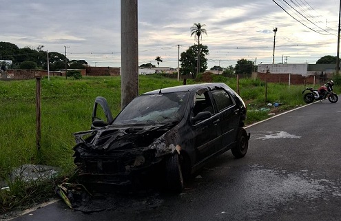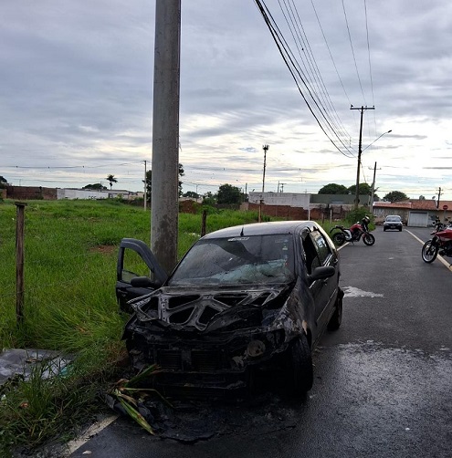 Um carro foi destruído por um incêndio após apresentar pane elétrica na Rua Joaquim Martins, no bairro Parque do Horto.