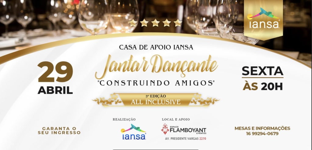 A Casa de apoio e acolhimento a pacientes com câncer – IANSA realizará um jantar dançante no dia 29/04, no espaço Flamboyant, com o objetivo de arrecadar fundos para a construção da nova sede do grupo. O prédio será construído no terreno doado por um apoiador do projeto porém carece de orçamento, tendo em vista que a entidade beneficente não recebe verba pública.