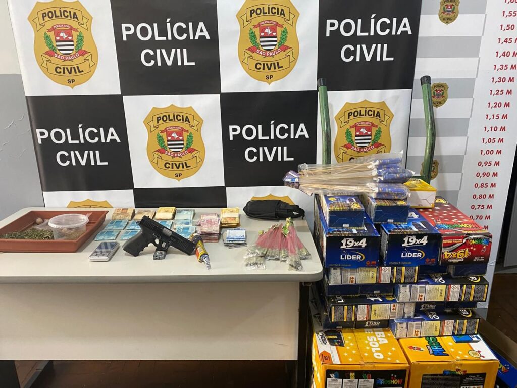 Ao abordarem o comerciante em um de seus dois imóveis, os policiais localizaram grande quantidade de fogos de artificio, 6 porções de maconha, o simulacro de arma de fogo e o dinheiro, cuja origem, o suspeito não conseguiu comprovar. OUÇA A ENTREVISTA: