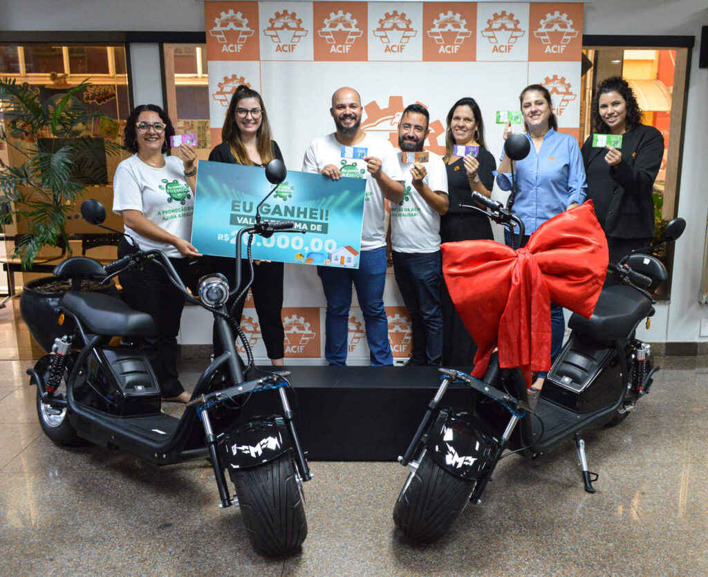 A ação aconteceu às 16h na sede da ACIF e foi transmitida ao vivo pelo Instagram da entidade, revelando os nomes de sorte: Angélica B. F. Castro, Maria Fátima da Silveira, Manuel Messias dos Santos, Haroldo Auode Totelis e Fernanda Gonçalves Santos. Cada um deles levou para casa uma moto scooter elétrica por terem adquirido nas respectivas lojas participantes da campanha: CBF Flexíveis e Assessórios, Routeway Internet, Posto Paineirão, Farmácia Cruzeiro e Calçados Milano. Já o vale-reforma de R$ 20 mil foi para Rosaura Garcia Zucollo, cliente do Posto Vitória, na Avenida Brasil.