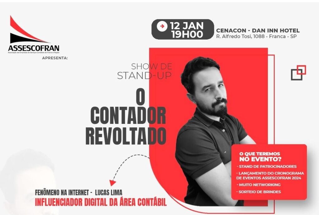 O empresário e influenciador digital da área contábil, Lucas Lima, mais conhecido como “Contador Revoltado”, estará em Franca nesta sexta feira, dia 12, a partir das 19h, para o primeiro show de stand-up da Assescofran. O local é a Cenacon ( Rua Alfredo Tosi, 1088 ), sendo que as vendas de ingressos serão exclusivas pela Quero2 ingressos, ao custo de R$ 80,00. Sem dúvida uma ótima oportunidade de curtir esta apresentação e dar boas risadas. Parabéns à Diretoria da Assescofran, através da Presidente Eliane Macedo, por trazer este grande espetáculo para nossa Franca.