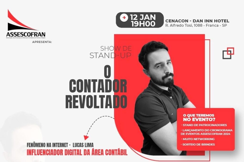 O empresário e influenciador digital da área contábil, Lucas Lima, mais conhecido como “Contador Revoltado”, estará em Franca no próximo dia 12, a partir das 19h, para o primeiro show de stand-up da Assescofran. O local é a Cenacon ( Rua Alfredo Tosi, 1088 ), sendo que as vendas de ingressos serão exclusivas pela Quero2 ingressos, ao custo de R$ 80,00. Sem dúvida uma ótima oportunidade de curtir esta apresentação e dar boas risadas. Parabéns à Diretoria da Assescofran, através da Presidente Eliane Macedo, por trazer este grande espetáculo para nossa Franca.