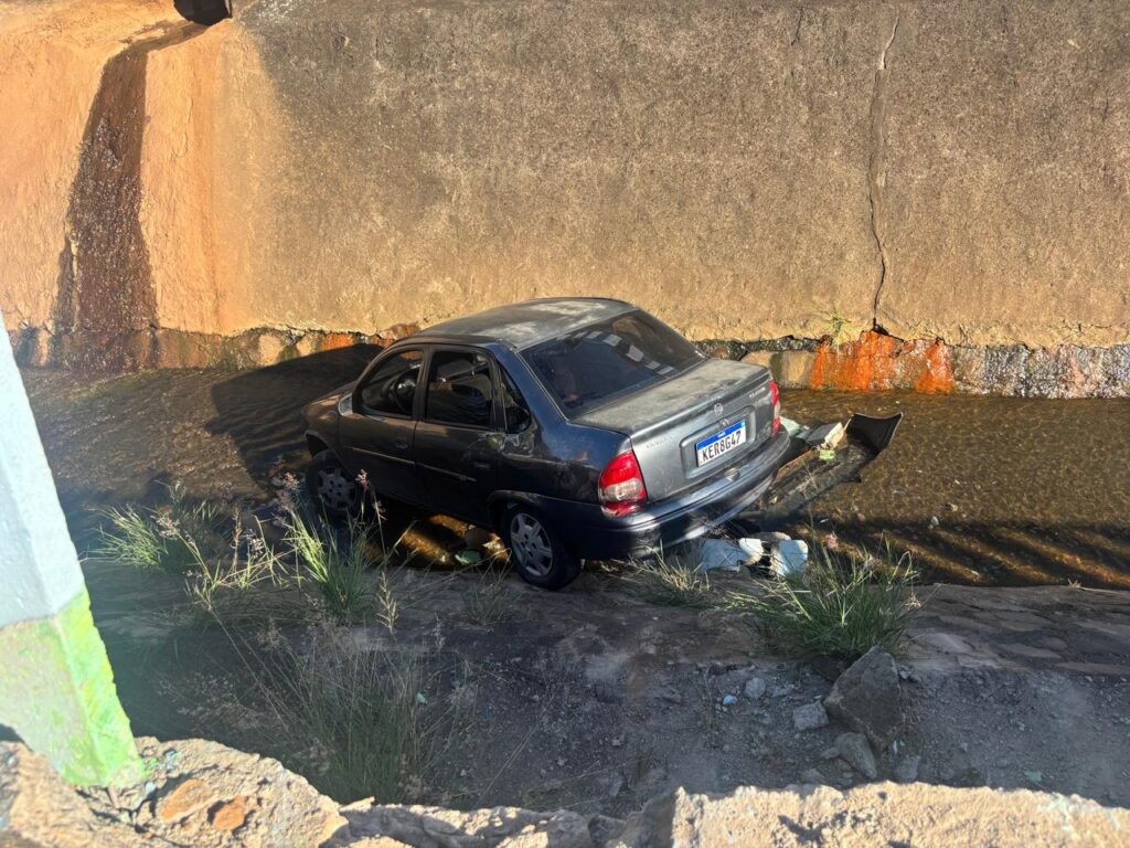 Início » Corsa cai em córrego após acidente em rotatória da avenida Orlando Dompieri e mobiliza resgate