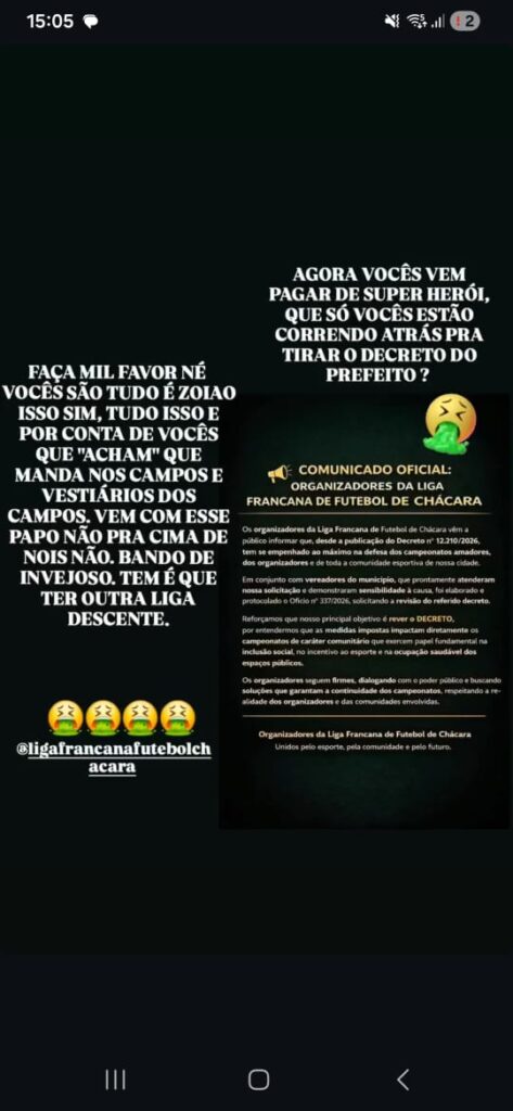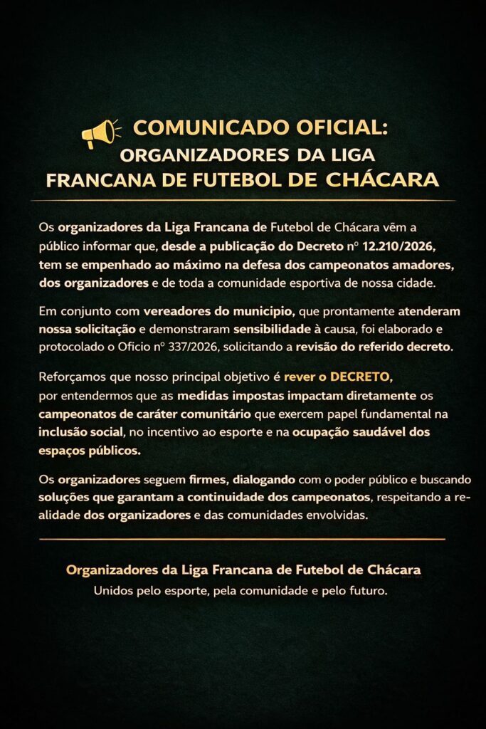 Um dos primeiros a comentar o decreto nas redes sociais, o radialista Luis Dedão, do portal e rádio FNT, disse que só a Liga Francana de Futebol de Chácara teria em torno de 5 mil atletas que utilizam os campos de chacrobol todos os finais de semana em Franca. VEJA O VÍDEO: