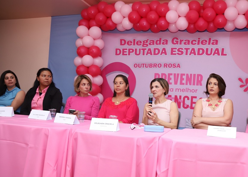 Uma tarde de outubro cor de rosa. Mais de 50 mulheres de 38 cidades se deslocaram a Franca, nesta segunda-feira, 20, para participar de evento promovido pela deputada Delegada Graciela. A inédita iniciativa teve o objetivo de unir forças na luta contra o câncer de mama.