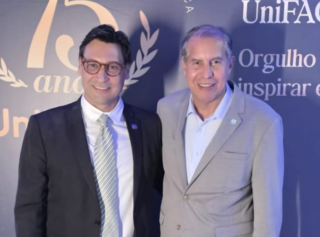 Início » Em um encontro marcado por prestígio e celebração, o reitor do Centro Universitário Uni-Facef, Dr. José Alfredo de Pádua Guerra, e o vereador Marcelo Tidy se reuniram durante a solenidade em comemoração dos 75 anos da instituição. A ocasião, repleta de significado, evidenciou não apenas a trajetória de excelência do Uni-Facef, mas também a união de lideranças comprometidas com o desenvolvimento educacional e social. Juntos, celebraram este marco histórico com entusiasmo e reconhecimento à importância dessa instituição para toda a comunidade.