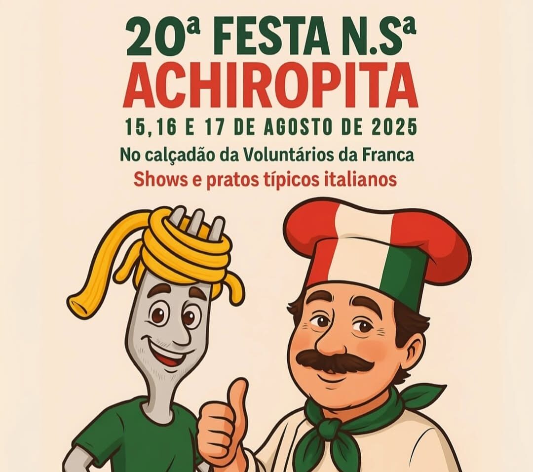 Começa nesta sexta feira, no Calçadão da Voluntários, mais uma edição da Festa de NS Achiropita, promovida pela Sociedade Italiana de Franca. Muita comida boa, diversão e a oportunidade de ajudar diversas entidades de nossa cidade. Serão 3 dias de muita diversão, música italiana, ambiente acolhedor e familiar, comidas típicas. Uma verdadeira celebração da cultura e da alegria! A tradicional festa de NS. Achiropita irá reunir cores, sabores e sons que encantaram moradores e visitantes. Música ao vivo, comidas irresistíveis e aquele clima acolhedor que só um evento assim proporciona. Mais do que entretenimento, será um momento de encontro, união e preservação das raízes italianas. Participe.