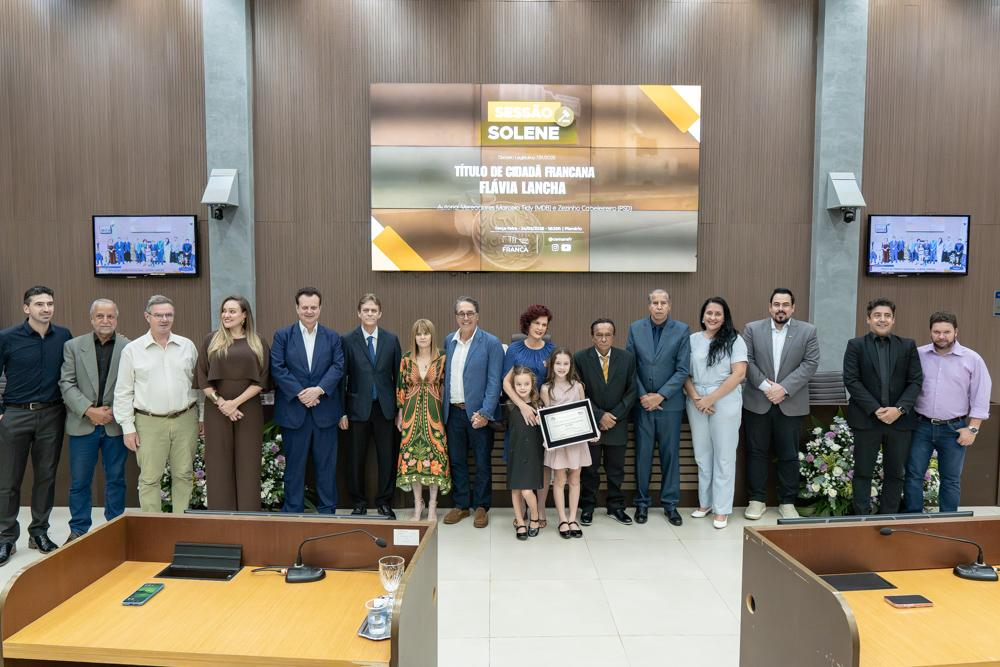 Considerado o mais alto reconhecimento do Legislativo francano, o título de cidadã francana é destinado a pessoas que, mesmo não sendo naturais da cidade, contribuem de forma significativa para o seu crescimento. Natural de Ribeirão Preto, Flávia Lancha se destaca por iniciativas voltadas à educação ambiental e ao impacto social, como o Instituto ICOL e a GIMA, que ao longo dos anos têm beneficiado milhares de pessoas.