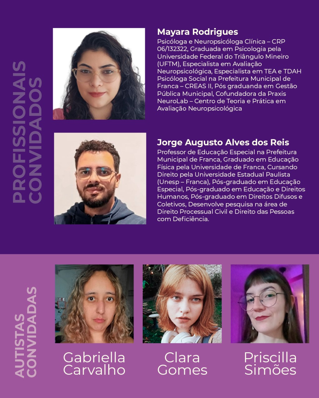 Participações especiais das mulheres autistas Clara, Gabi e Priscila, compartilhando suas trajetórias no espectro.