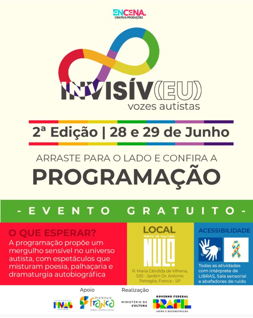 Franca receberá nos dias 28 e 29 de junho a segunda edição do projeto “Invisív(eu): Vozes Autistas”, um festival gratuito que convida o público a mergulhar nas diversas nuances do universo autista, celebrando o Mês do Orgulho Autista. Com uma programação sensível, potente e totalmente acessível, o evento ocorre no Ponto de Cultura Espaço Nulo, trazendo cenas curtas, rodas de conversa e um show musical para fechar em alto estilo.
