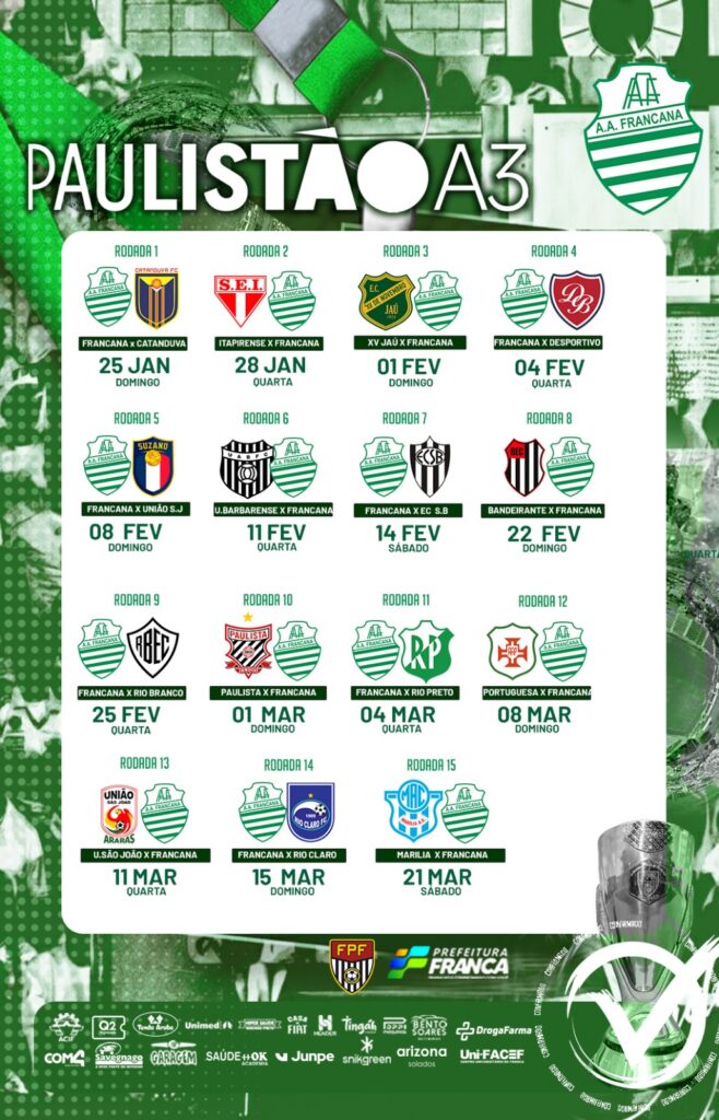 A Francana teve a definição dos seus adversários nos campeonatos mais importantes para 2026. Na última semana a Federação Paulista de Futebol detalhou as tabelas do Campeonato Paulista A3 e da Copa São Paulo de Juniores.