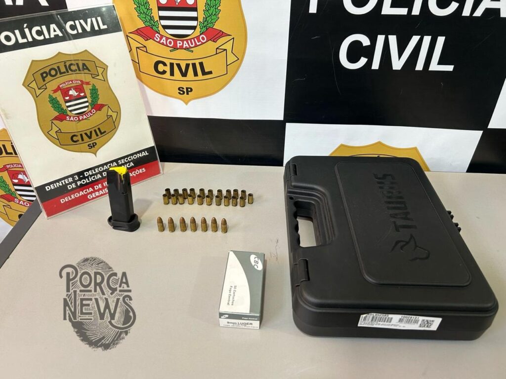 A prisão ocorreu após o cumprimento de mandado de busca e apreensão na residência do investigado. No local, os policiais civis encontraram munições de calibre 9mm — algumas intactas e outras deflagradas —, além de um carregador de pistola com capacidade para 16 tiros e uma case da marca Taurus.