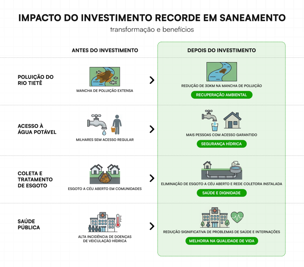 Assim como a família da Michelle, milhões de lares paulistas passaram a contar com serviços de saneamento básico desde a desestatização da Sabesp, em julho de 2024. Em 2025, a Companhia realizou investimento recorde de R$ 15,2 bilhões, frente aos R$ 6,9 bilhões do ano anterior, ampliando o acesso aos serviços, promovendo ganhos em saúde pública e contribuindo para a melhoria da qualidade de rios, córregos e praias.