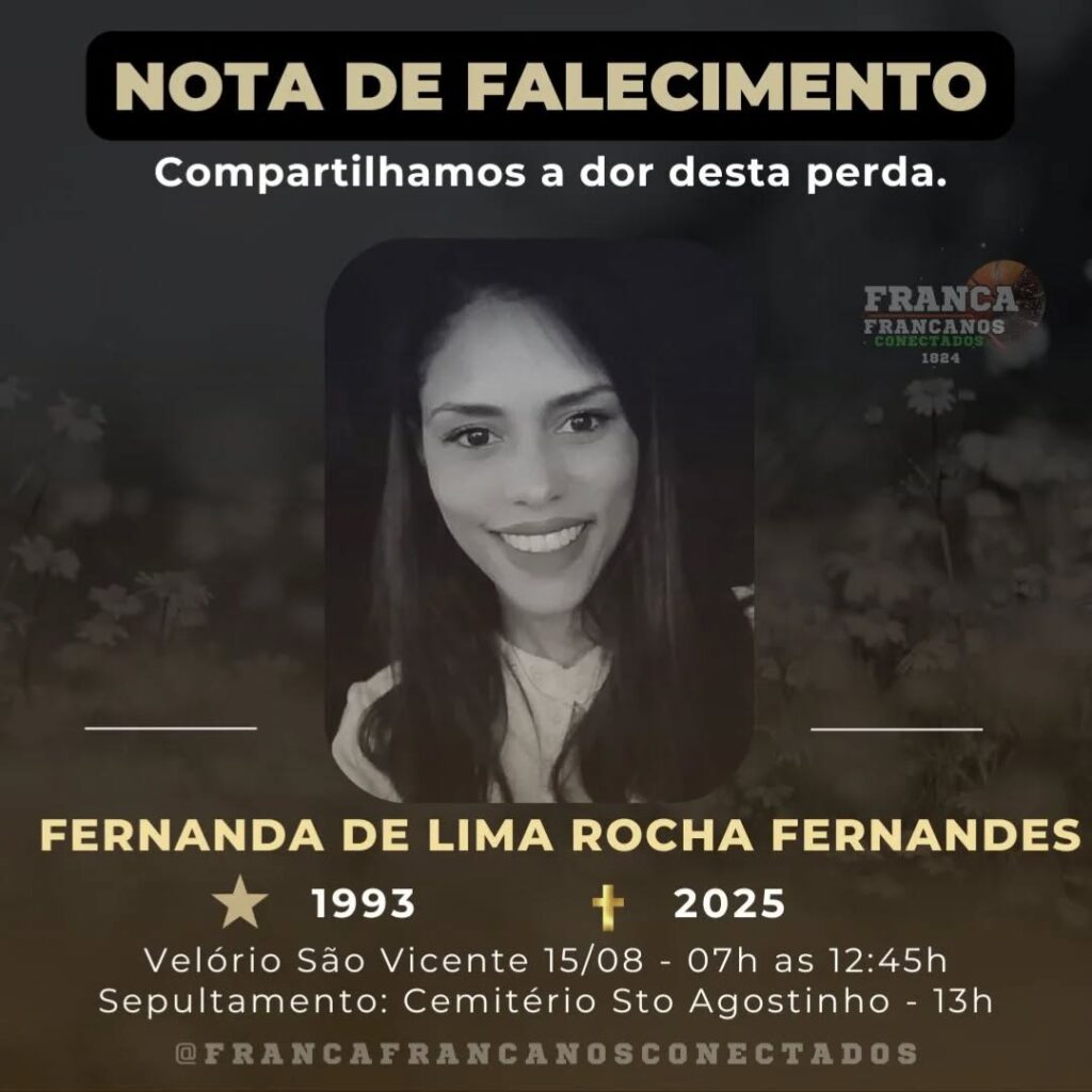 Morreu nesta quinta-feira, 14, aos 32 anos, Fernanda de Lima Rocha Fernandes. Ela vinha lutando contra um tumor em estágio de metástase desde 2023. Em um post nas redes sociais o grupo Franca Francanos Conectados, lamentou a perda.