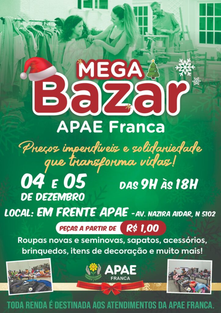 A APAE (Associação de Pais e Amigos dos Excepcionais) de Franca realiza nesta quinta e sexta-feira, dias 4 e 5 de dezembro, mais uma edição do tradicional Mega Bazar de Natal, iniciativa que já faz parte do calendário da instituição e da comunidade francana. O evento será realizado das 9h às 18h, em um galpão localizado em frente ao prédio da APAE, na Avenida Nazira Aidar, 5.102, no Parque Moema.