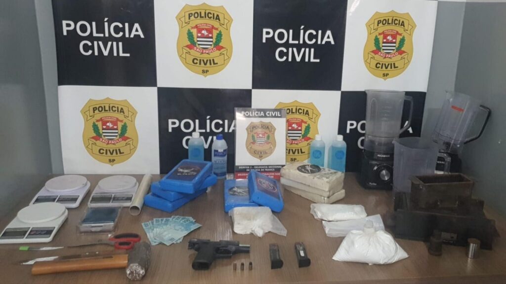 Uma prensa grande, uma forma, liquidificadores, quatro balanças, duas facas, tesoura, marreta, rolo de plástico, insufilme, quatro frascos de acetona, um aparelho celular, uma pistola Taurus, 03 munições calibre 380, R$ 909,00, além de quatro tijolos inteiros e uma metade de tijolo de cocaína pesando 4,820 quilos, três invólucros contendo pó branco de cocaína, totalizando um quilo e quatro tijolos de cocaína pesando 4,330 quilos. Todo este montante foi apreendido por agentes da Dise( Delegacia de Investigações Sobre Entorpecentes) em um imóvel no Residencial Pacaembu, na tarde desta segunda-feira, 4. A operação ainda resultou na prisão de um homem de 27 anos, tido como integrante de uma facção criminosa que age em presídios no Estado de São Paulo, liderada por Marcos Willians Herbas Camacho, o “Marcola”, atualmente preso em Brasilia.