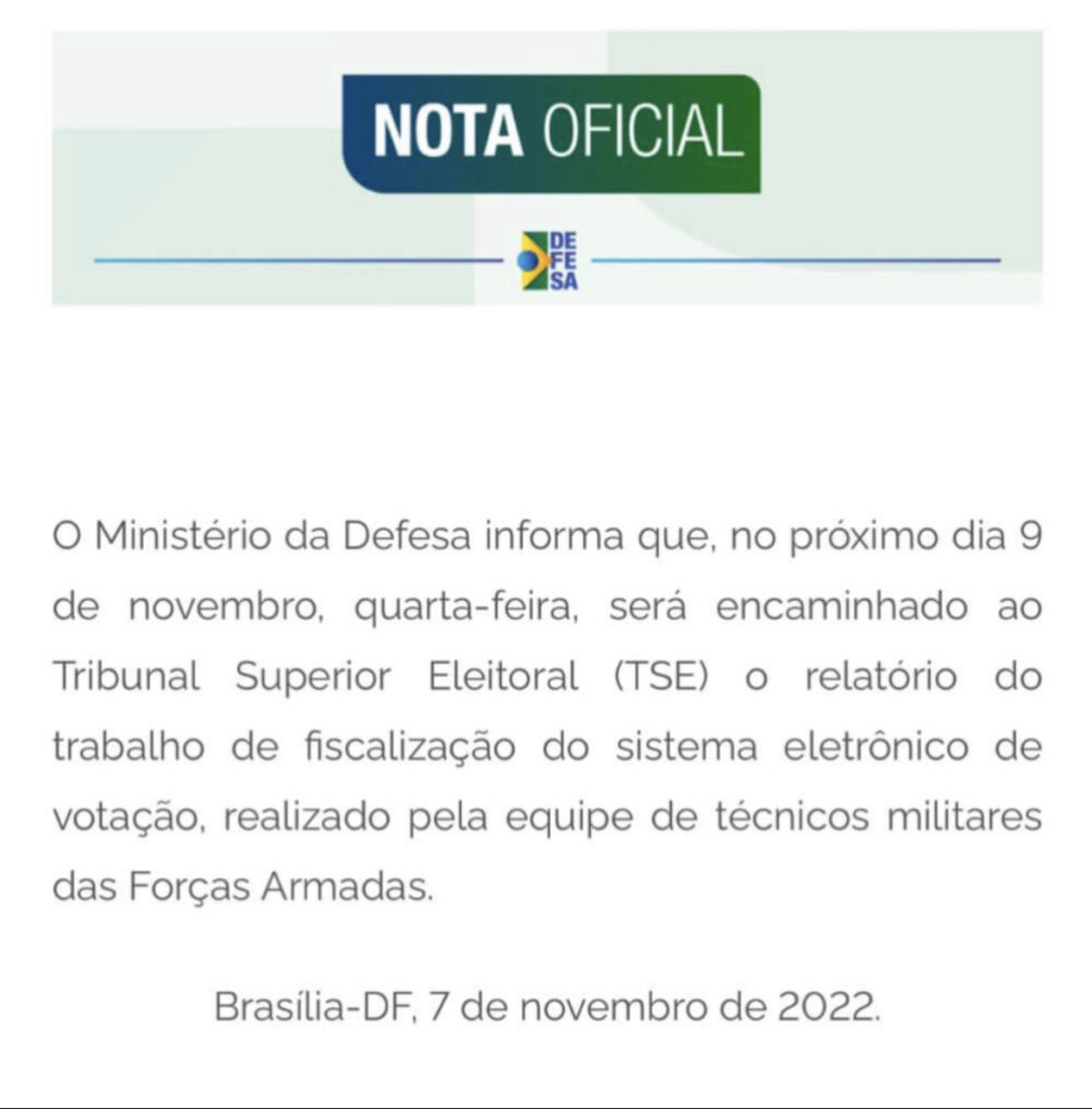 O Ministério da Defesa do Governo Federal acaba de emitir uma nota oficial informando que na próxima quarta-feira (9), encaminhará ao TSE o relatório sobre o sistema das urnas eletrônicas das eleições de 2022, realizado por uma equipe técnica de militares das Forças Armadas.