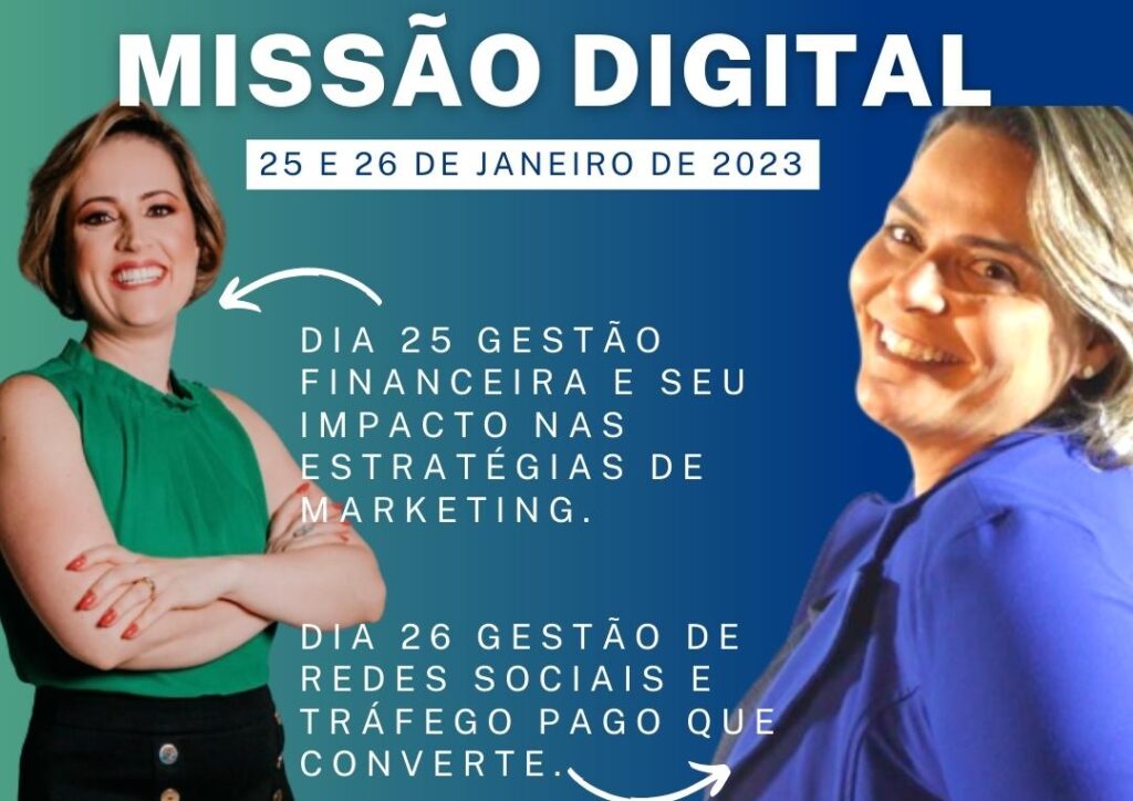 Acontecerá nos dias 25 e 26 de janeiro o evento Missão Digital, às 19h com aula ao vivo pelo zoom totalmente gratuita. Haverá certificado de presença para quem atingir 75% de presença. Sem dúvida, uma grande oportunidade de aprender mais sobre Gestão Financeira e Marketing. No dia 25, Thalisa Gilberto falará sobre Gestão Financeira e seu Impacto nas Estratégias de Marketing e no dia 26, Nádia Carvalho estará falando sobre Gestão de Redes Sociais e Tráfego Pago que Converte. Inscrições podem ser feitas pelo whatszap 99273-9314.