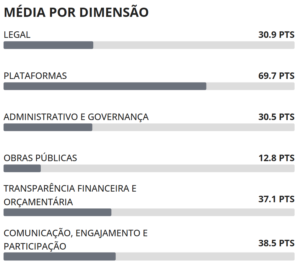 Na dimensão Obras Públicas, a média regional foi de apenas 12,8 pontos, classificada como péssimo. Quatro municípios zeraram completamente nesta dimensão: Brodowski, Igarapava, Morro Agudo e Orlândia, enquanto apenas outras quatro prefeituras – Guaíra, Guará, Igarapava e Ipuã – possuem portal ou plataforma específica para dar transparência às obras públicas.