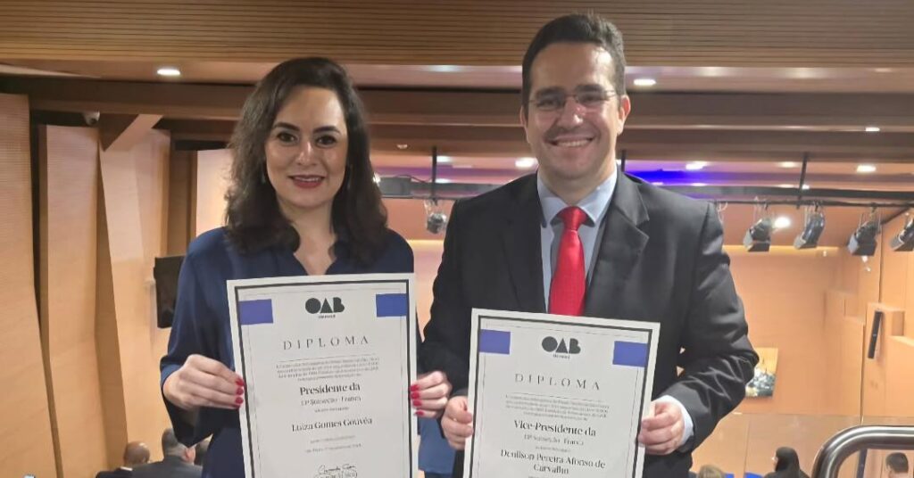 Os muito dinâmicos e atuantes profissionais da área jurídica, Dra. Luiza Gouvêa e Dr. Denílson Carvalho foram oficialmente diplomados, na sede da OAB-SP, como Presidente e Vice da 13.ª Subseção da Ordem dos Advogados do Brasil (OAB) em Franca. Dra. Luiza tornou-se a primeira mulher a ocupar o cargo na história da entidade, ela que na última gestão foi Vice Presidente na chapa de Acir de Matos Gomes. A nova gestão da subseção francana inicia seus trabalhos com foco na valorização da advocacia, no fortalecimento institucional e na ampliação dos serviços prestados aos profissionais da nossa cidade. Parabéns aos amigos, Luiza e Denílson, a quem desejamos uma gestão de sucesso e comprometimento com a classe jurídica de nossa Franca.