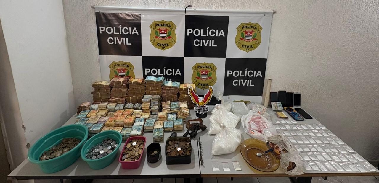 A maior surpresa foi a quantidade de dinheiro guardada no local. Após a contagem, foi confirmado o montante de R$ 475.430,00 em espécie, valor que reforça a suspeita de forte atuação no tráfico.