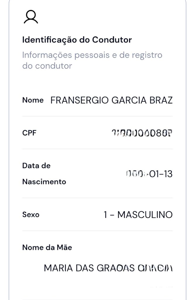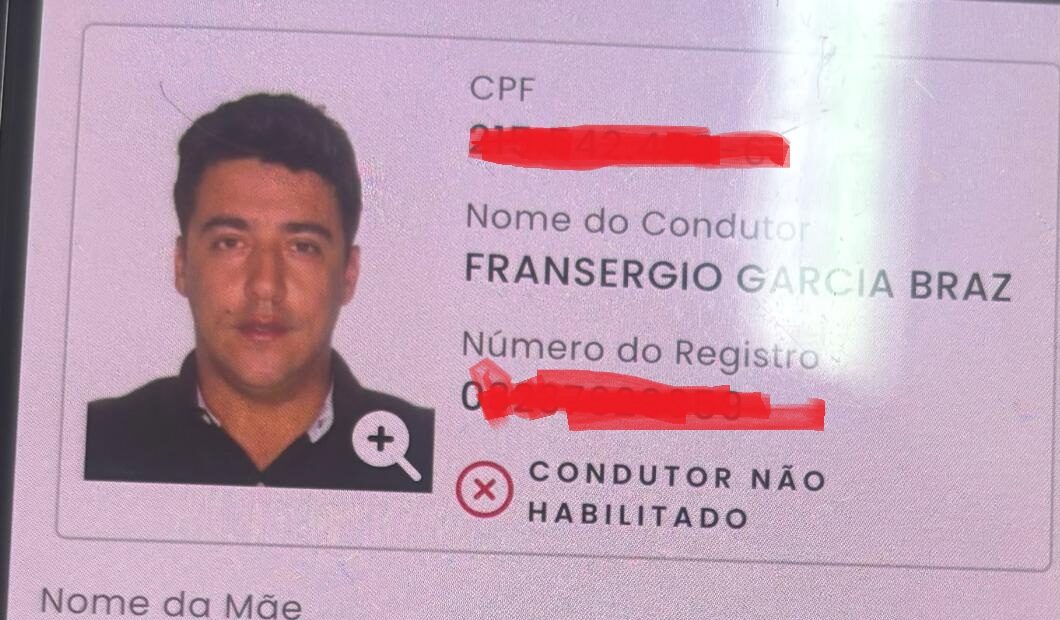 De acordo com registros obtidos pela reportagem, Fransérgio Garcia possui CNH categoria AB, emitida em 20 de junho de 2014, com validade expirada em 5 de março de 2019.