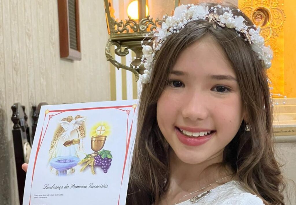É com alegria que hoje faço o devido destaque a muito graciosa Lia Nacano Sá, que recebeu a Primeira Eucaristia no último dia 11, no Santuário Santo Antônio. Em uma solenidade das mais emocionantes, sua família esteve presente aplaudindo sua conquista, como seus pais, Tatiane e Jorge e seus avós, Marilda, Silvia e Vitor. A foto destaca Lia, toda feliz, no dia que recebeu a Comunhão.