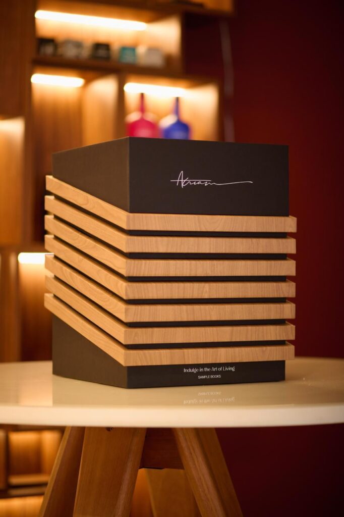 A Caixa de Amostras foi concebida para servir como uma vitrine elegante e funcional, destinada a arquitetos e compradores, organizando e expondo as matérias-primas utilizadas na fabricação dos móveis Atriani.