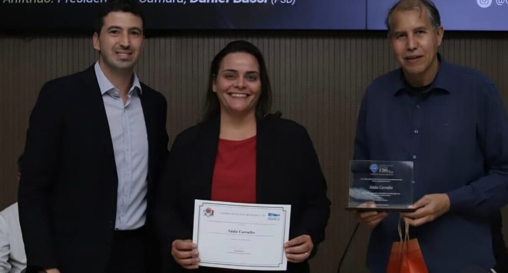 Destaque para o trabalho conjunto que fortalece a comunicação e a representatividade! Em sessão solene na Câmara Municipal, que marcou os 120 anos do Lar São Vicente de Paulo, a presença marcante de Nádia Carvalho, destacada profissional da área de marketing digital ao lado de dois vereadores combativos de nossa Câmara, que são os caríssimos Marcelo Tidy e Daniel Bassi, evidencia a importância da estratégia, da visibilidade e do engajamento nas ações públicas. Um momento que celebra a união entre comunicação eficaz e compromisso com a população. Nádia recebeu homenagem marcante, já que muito se destaca por sua atuação estratégica, domínio de ferramentas digitais e resultados expressivos em campanhas de engajamento e posicionamento de marcas.