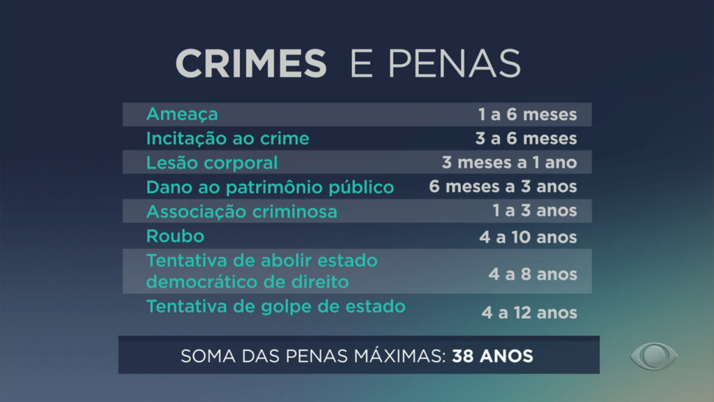 A prisão das pessoas que invadiram as sedes dos três poderes é só o começo de uma grande investigação e, provavelmente, de um longo processo judicial. As penas dos crimes contra o estado democrático de Direito chegam a 12 anos de prisão. Mas a punição pode ser ainda mais severa, se forem considerados outros crimes praticados em conjunto.