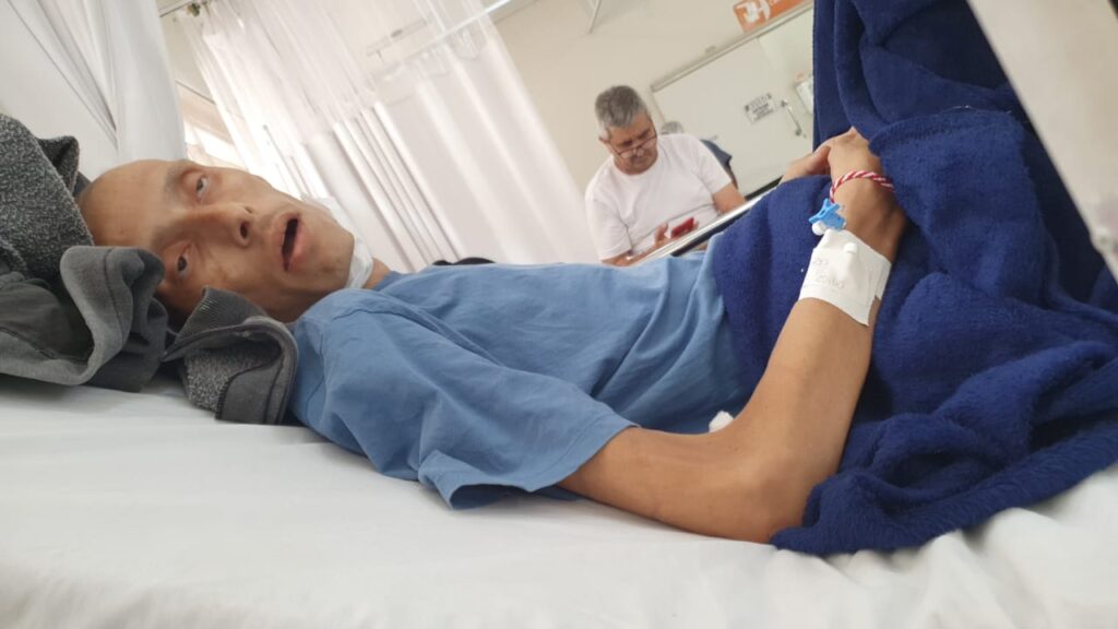 Este paciente da foto é Reginaldo da Silva, morador de Franca. Ele tem 39 anos, é paciente oncológico, e faz tratamento em Barretos. Reginaldo está há 3 dias passando mal, pois devido a doença, ele está vomitando fezes.